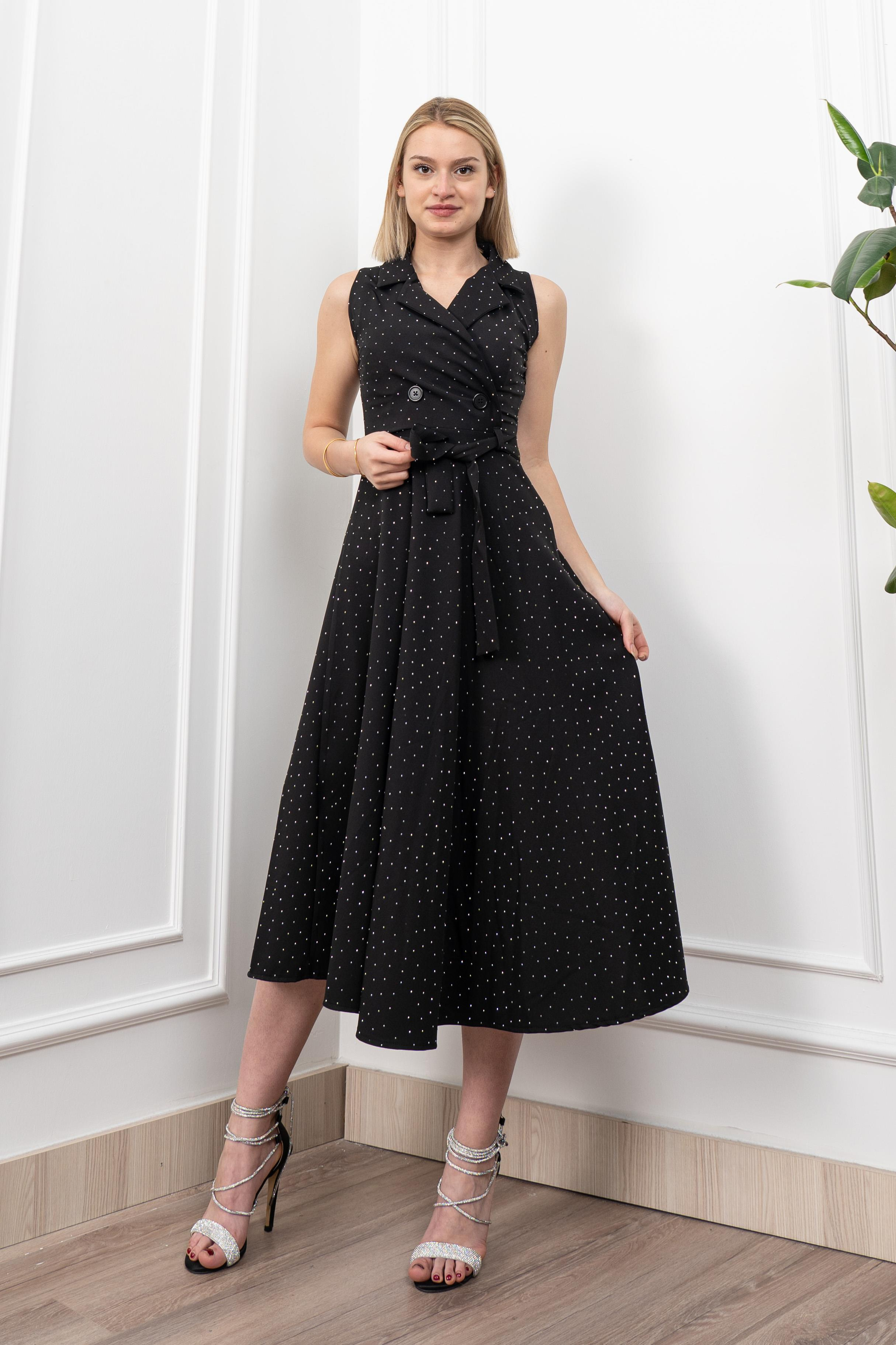 Beli Kuşaklı Yakalı Ve Taş Detaylı Uzun Elbise - Likralı Esnek iç göstermez
