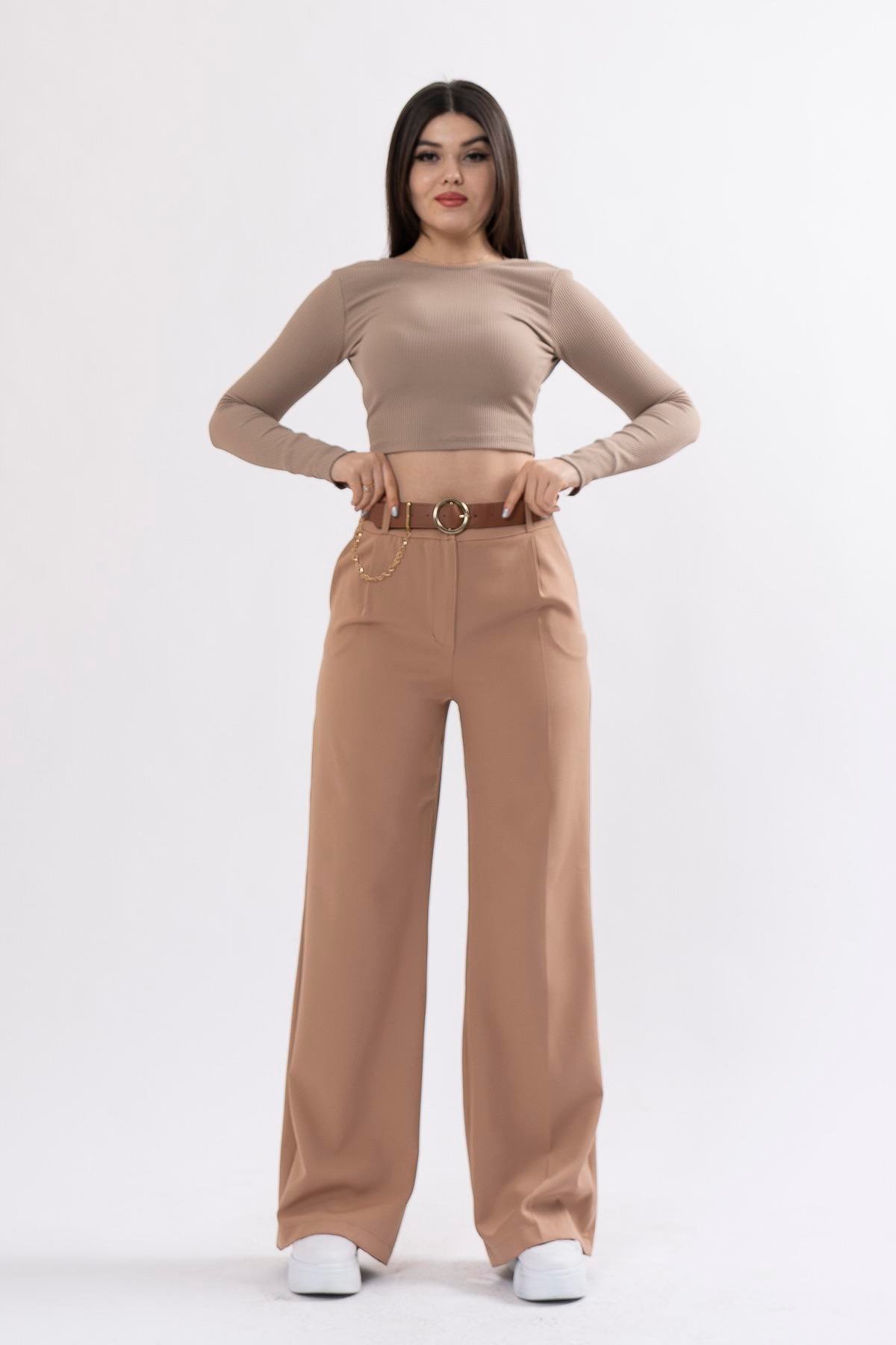 💡 Özel Tasarım Detayları: Pantolon, bel kısmında yer alan kemer ve zarif zincir detayı ile benzersiz bir görünüm sunar. Bu ince detaylar, pantolonun şık tasarımını daha da vurgular.