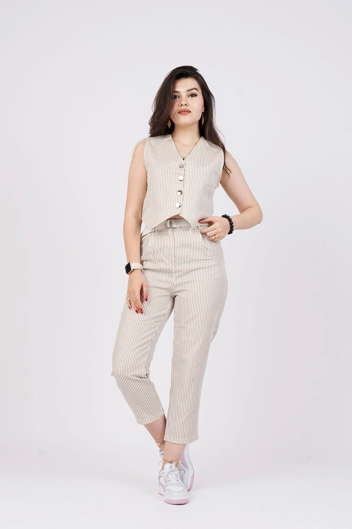 Çizgili Yelek Ve Kemerli Pantolon Kot Gabardin Kumaş Takım 9107