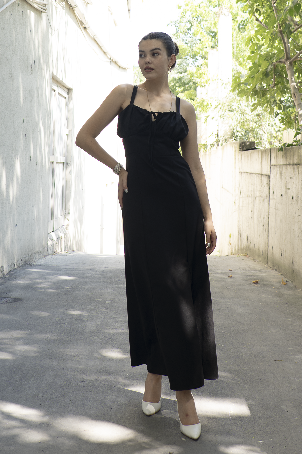 Göğüs büzgüsüyle feminen bir dokunuş, önden yırtmaç detayıyla zarif bir yürüyüş...