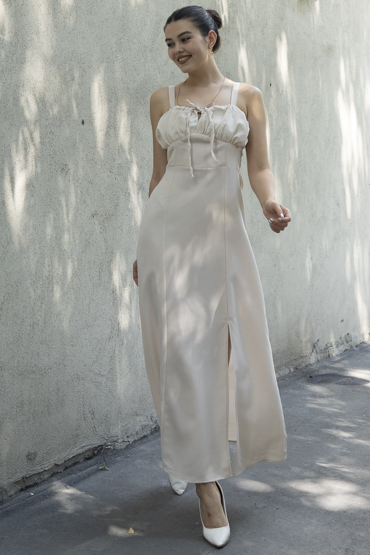 Göğüs Büzgülü Önden Yırtmaçlı Straplez Askılı Uzun Elbise 50322 (25MYARY50322-264)