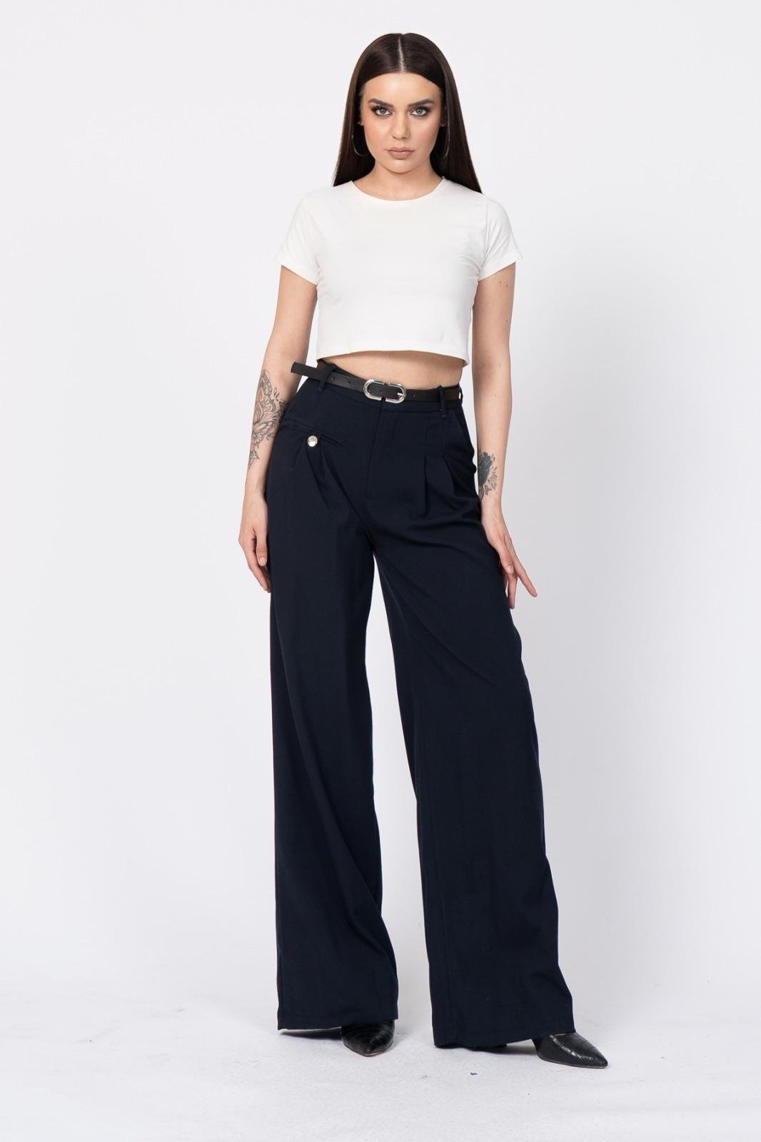 Kemerli Ve Pileli Cep Düğme Detaylı Bol Paça Pantolon