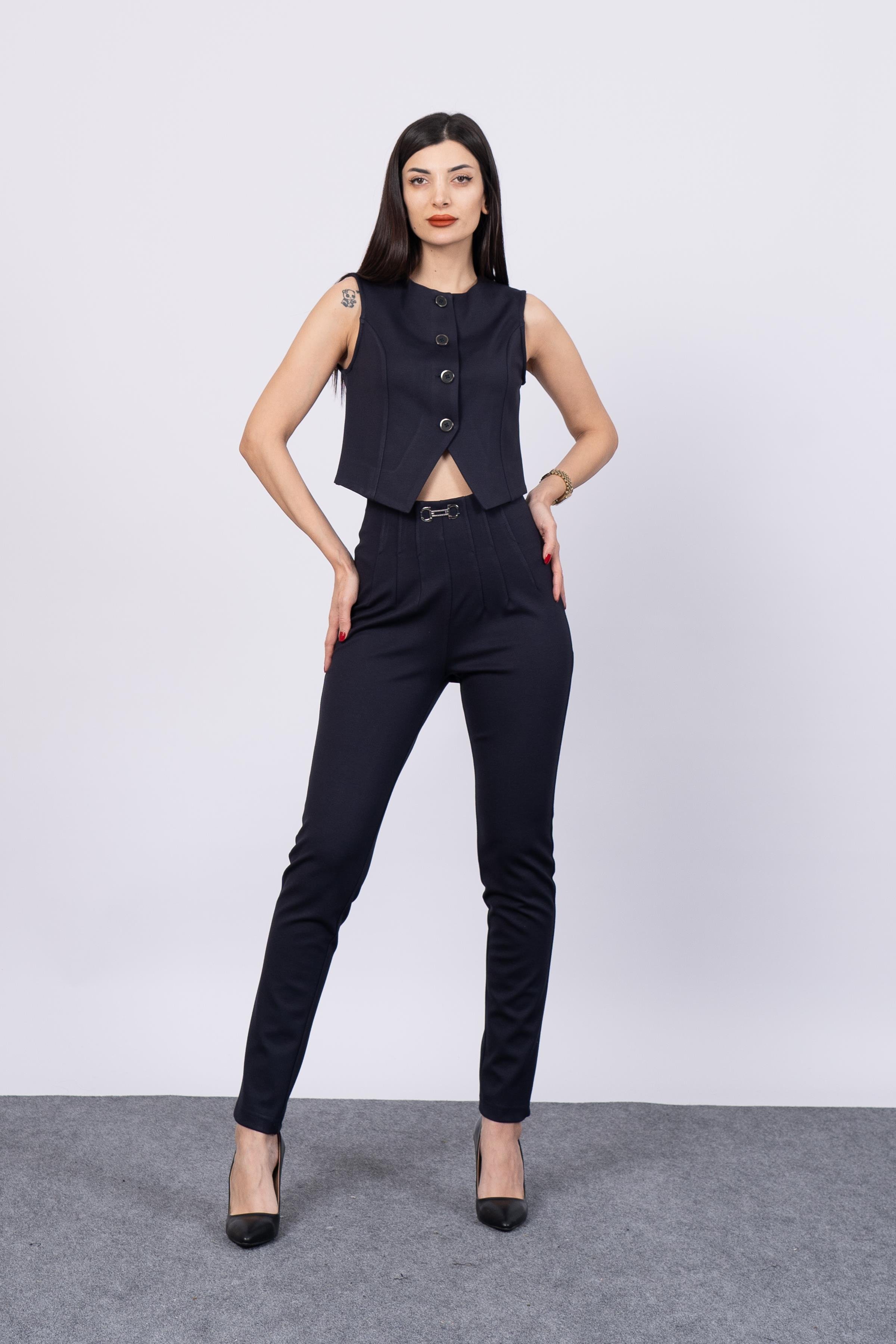 Önü Pens Ve Aksesuar Detaylı Çelik Örme Pantolon