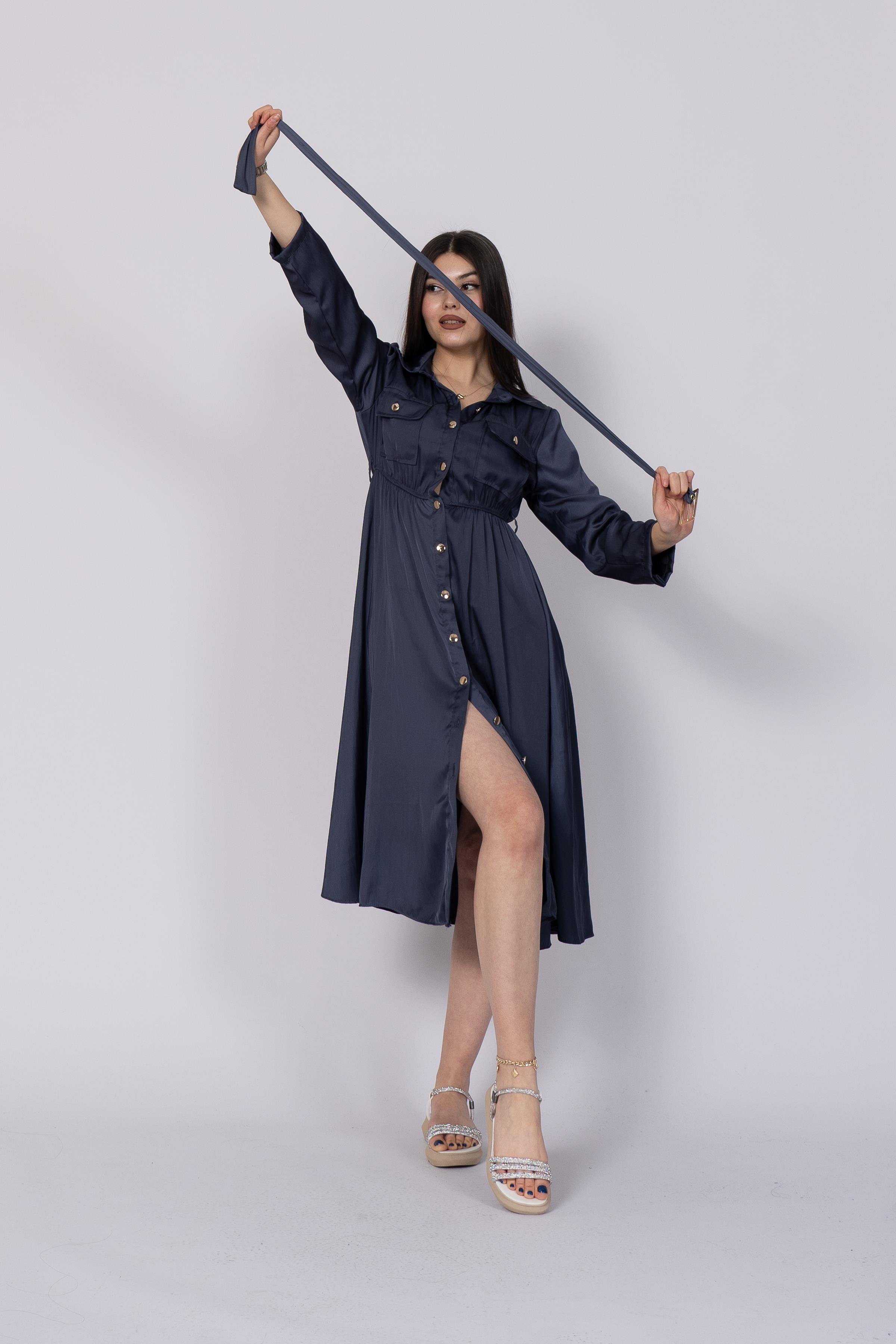 Uzun Kollu ve Kolları Katlana Bilen Boydan Düğmeli Beli Lastikli Saten Elbise 50306