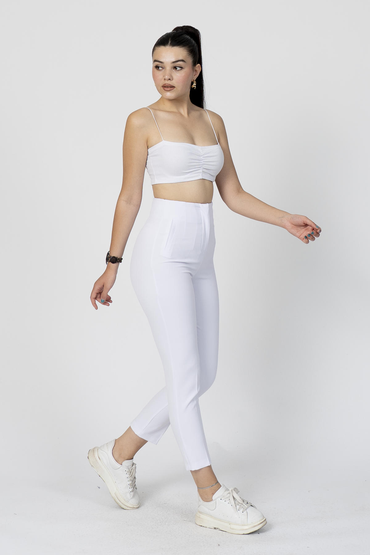 Önden pens detaylı, yüksek bel, kısa paça, süs cepli görünüm – az likralı dokuma kumaşıyla şıklık & konfor bir arada!